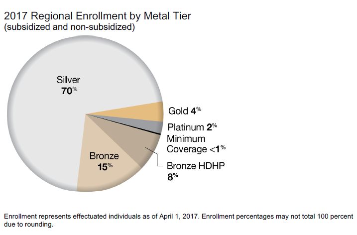 The fourth most popular plans are Gold and Platinum health insurance plans, which made up a combined total of 6% of Kern County's total enrollment in 2017. These plans offer the very best coverage and they have a $0 deductible, but they can be overpriced. We generally only recommend Gold and Platinum plans when somebody is an expectant mother or a person has a chronic health condition that requires constant treatment and expensive medication.